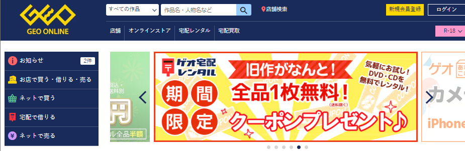 ゲオの宅配レンタルサービスに新規登録すると、無料レンタルクーポンが提供され、不定期配布のクーポンももらうことができます。